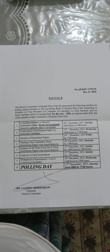 کراچی پریس کلب میں ہرسال کی طرح امسال بھی بروز ہفتہ 27/دسمبر 2025ء کو 2026ء کے لیے انتخابات کا اعلان ہو چکا ہے، جس کی تیاری کے سلسلے میں کاغذات نامزدگی کی وصولی کا آغاز آج بروز منگل بتاریخ 16/دسمبر 2025ء کو 4:00بجے شام سے 7:00 بجے شام تک ہوا۔