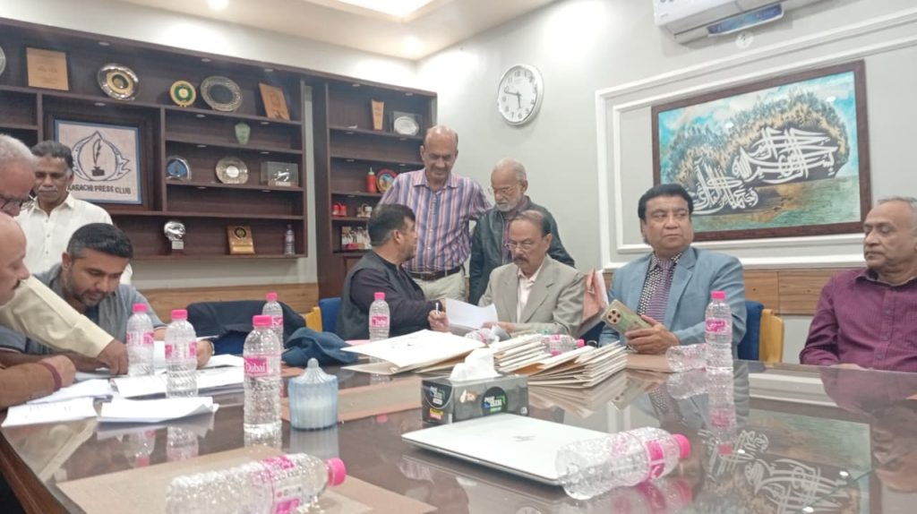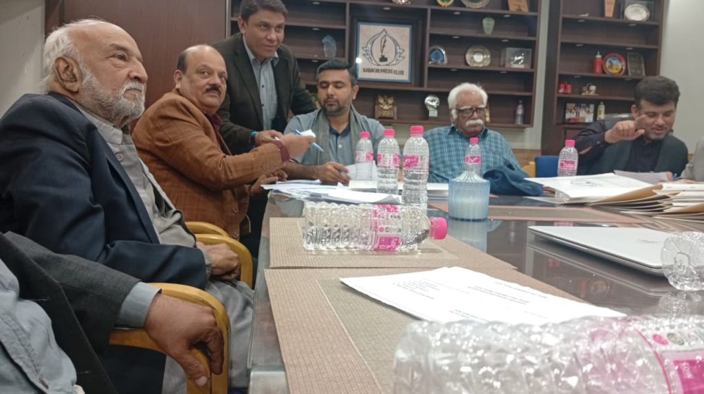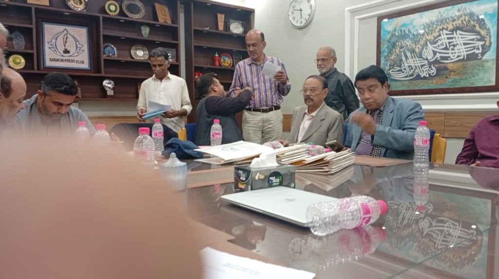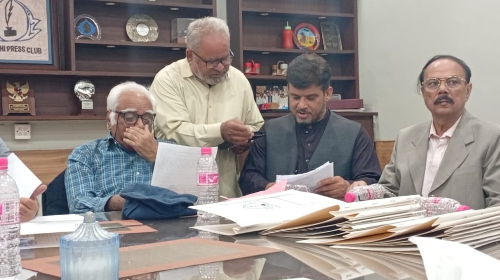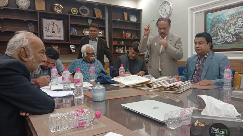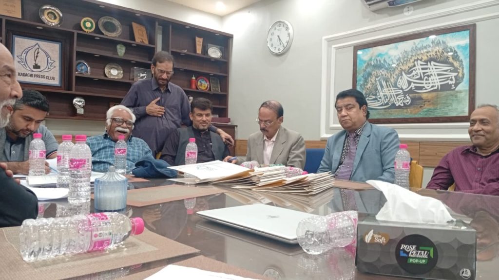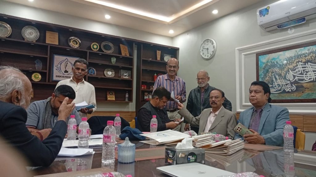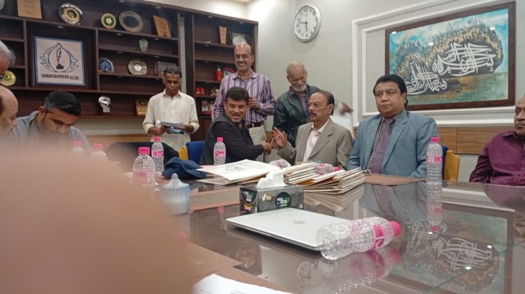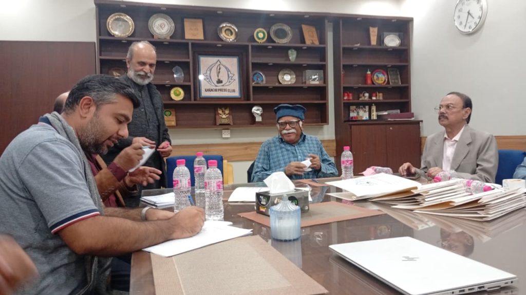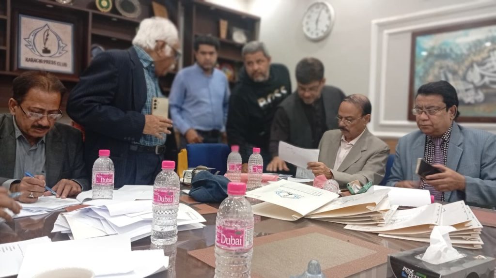 کراچی پریس کلب میں ہروز ہفتہ 27/دسمبر 2025ء کو 2026ء کے لیے انتخابات کی تیاری کے آخری مرحلے کے موقع پر آج بروز بدھ مورخہ: 23/دسمبر 2025ء کو کاغذات نامزدگی واپس لینے کی کارروائی کاوقت 4:00 بجے شام سے 7:00 بجے شام تک اپنے اختتام کو پہنچ چکا ہے، فہرست مرتب کی جارہی ہے، اِس موقع پر چیئرمین الیکشن کمیٹی کراچی پریس کلب ڈاکٹر توصیف احمد خان،ممبر الیکشن کمیٹی،حسن امام صدیقی، ڈاکٹر سعید عُثمانی، ڈاکٹر بَدَر سُومرو، ڈاکٹر سیف اللٌٰہ، سہیل سانگی، اطہر اقبال، ستار جاوید، فَاروق عَرشی، سلیم صدیقی، محترمہ رضیہ سلطانہ، محترمہ فروہ حسن، محترمہ فریحہ عاطف، محترمہ عالیہ سعید، عبد العزیز بلوچ، بلال ظفر، نورالھدیٰ، ریحان محمود خان، آصف احمد خان،احمد حسن اور خالد جمیل موجود ہیں۔